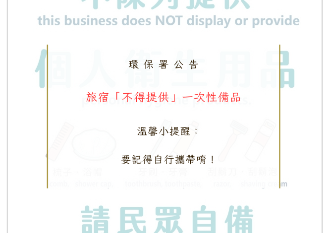 「一次用旅宿用品限制使用對象及實施方式」將自114年1月1日生效,限制觀光旅館業、旅館業、民宿及其他住宿業不得提供容量小於180毫升之液態盥洗及保養用品(洗髮乳、潤髮乳、沐浴乳及乳液),亦不得於營業場所陳列個人衛生用品(梳子、牙刷、牙膏、刮鬍刀、刮鬍泡及浴帽)供