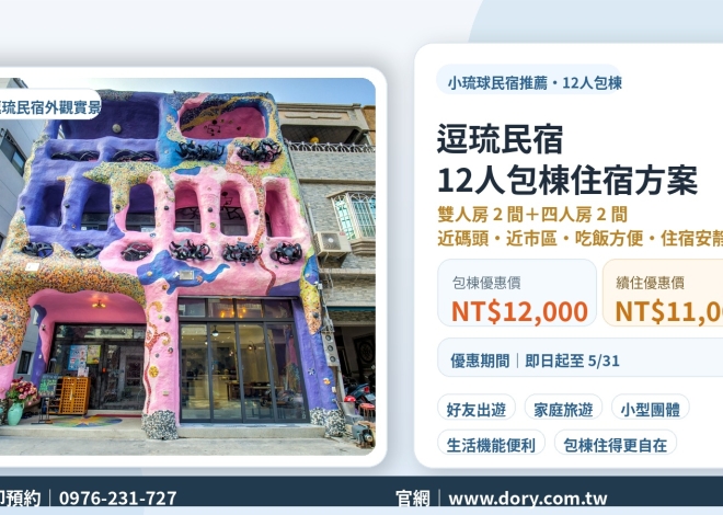 想找小琉球民宿推薦、小琉球住宿首選,或適合好友、家庭出遊的小琉球包棟民宿嗎?小琉球逗琉民宿推出 12 人包棟民宿方案,提供雙人房 2 間、四人房 2 間,包棟住宿只要 NT$12,000,續住優惠 NT$11,000,優惠至 5/31。民宿鄰近碼頭、吃飯方便、離市區近,住宿環境安靜,無論是兩天一夜輕旅行,還是三天兩夜放鬆行程,都很適合入住。