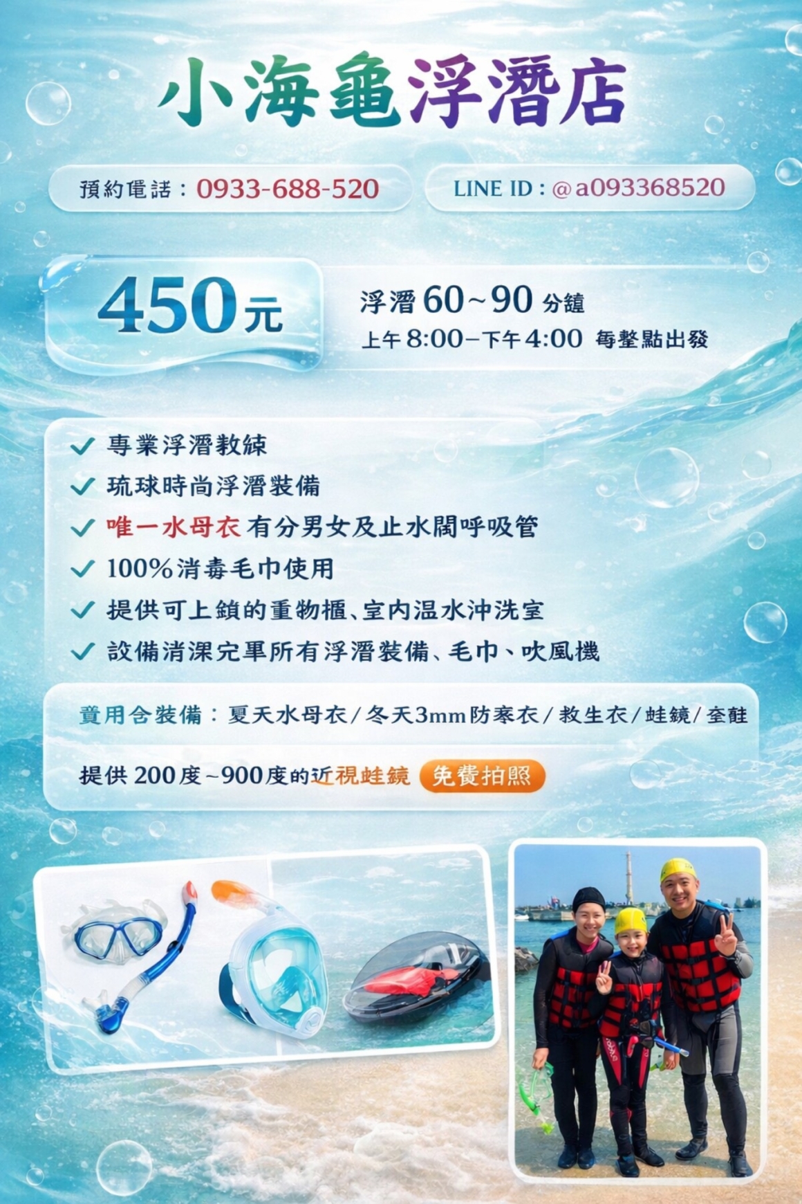 行前先看影片更安心:建議出發前先觀看「浮潛裝備穿著介紹以及水下安全宣導」影片,幫助您更快熟悉流程與安全重點。▶ 點我觀看教學影片